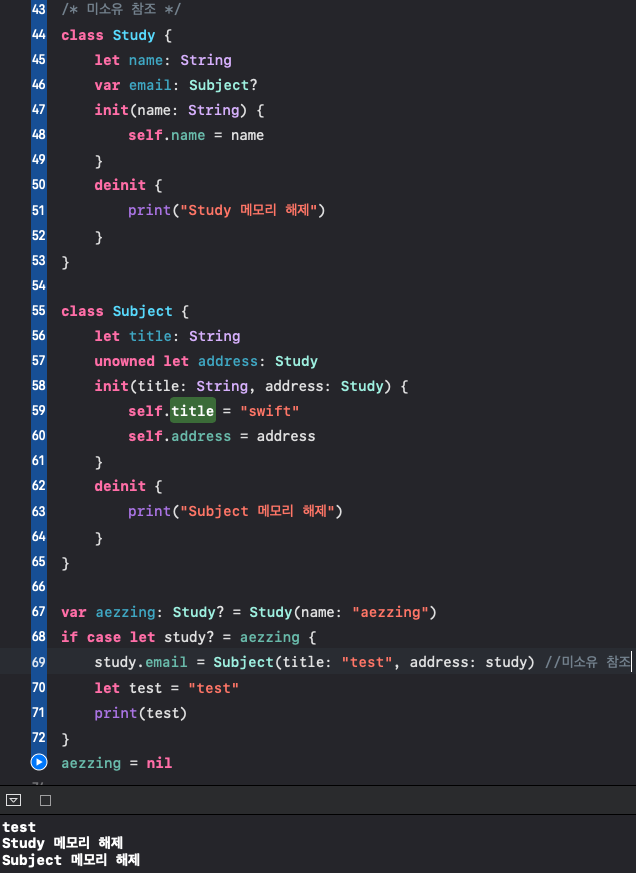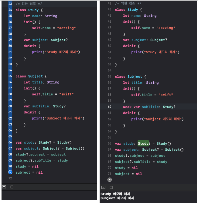 위의 사진에서 보듯이 두 클래스가 서로 참조 하고 있을때, 한 곳에 weak 와 옵셔널을 넣으면 메모리 해제가 잘 되는 것을 확인 할 수 있었다. (60번째 줄 확인)